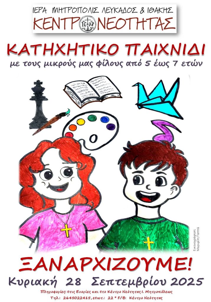 Από την ΚΥΡΙΑΚΗ 28 ΣΕΠΤΕΜΒΡΙΟΥ 2025 μπορούν, λοιπόν, τα παιδιά όλων των ηλικιών, από την προσχολική μέχρι τα παιδιά Γυμνασίου – Λυκείου, καθώς και οι ενήλικες να βρουν στις Ενορίες της Ι. Μητροπόλεώς μας (το ειδικότερο πρόγραμμα σύντομα θα ανακοινωθεί) ευχάριστες ευκαιρίες διαλόγου και επικοινωνίας, μόρφωσης και ψυχαγωγίας, δημιουργίας και ομαδικότητας, που αναπτύσσονται καθ’ όλη τη διάρκεια του έτους, με κέντρο πάντοτε την Αγία Τράπεζα και τη μυστηριακή ζωή της Εκκλησίας μας.