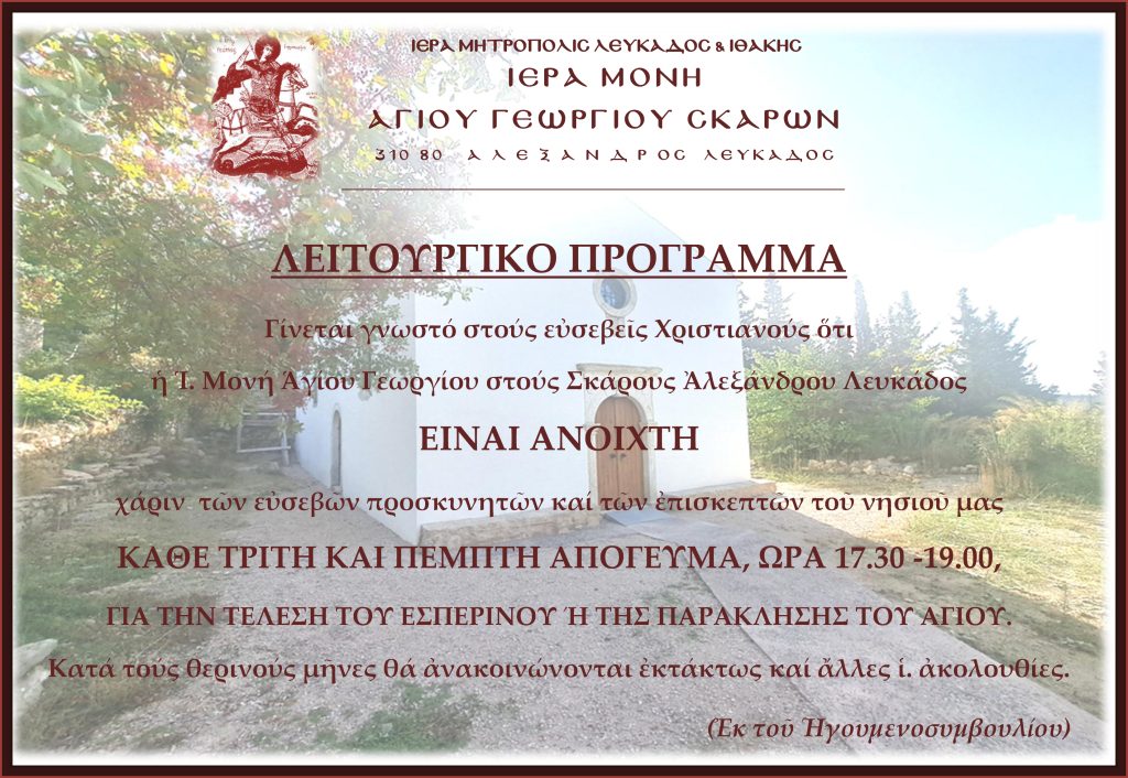 Γίνεται γνωστό στούς εὐσεβεῖς Χριστιανούς ὅτι  ἡ Ἱερά Μονή Ἁγίου Γεωργίου στούς Σκάρους Ἀλεξάνδρου Λευκάδος