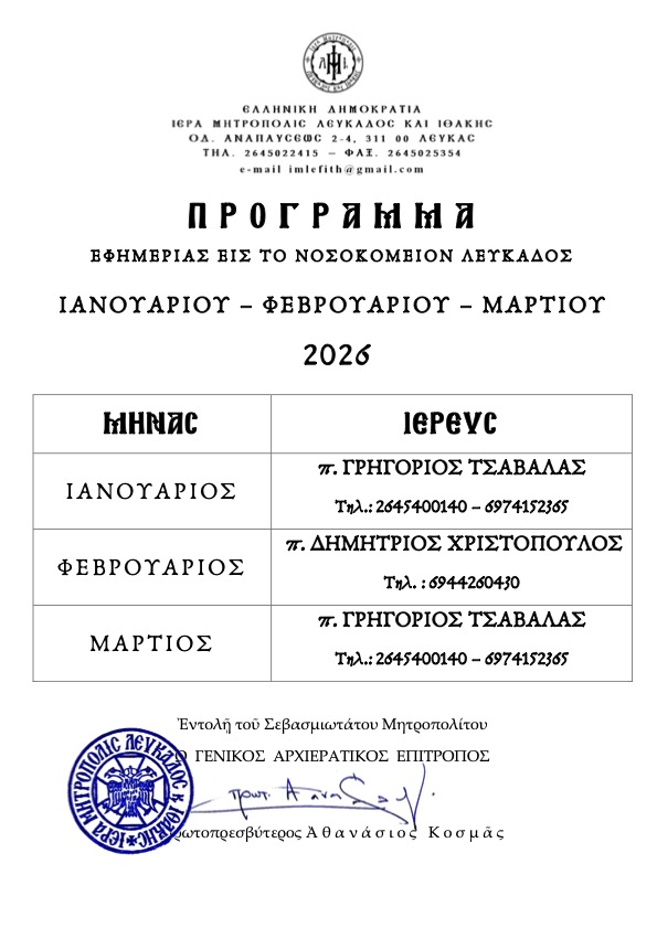 Ακολουθεί Λειτουργικό Πρόγραμμα Ιερού Παρεκκλησίου Αγίου Λουκά Νοσοκομείου Λευκάδος.