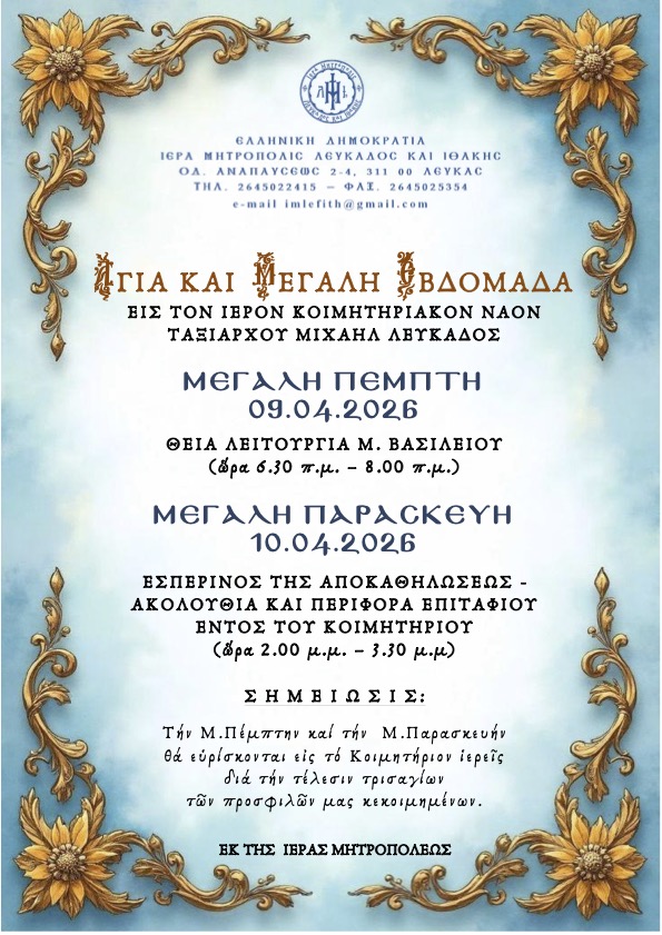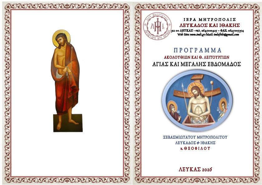 Ακολουθεί πρόγραμμα Αγίας και Μεγάλης Εβδομάδος 2026 Σεβασμιωτάτου Μητροπολίτου Λευκάδος και Ιθάκης κ. Θεοφίλου.