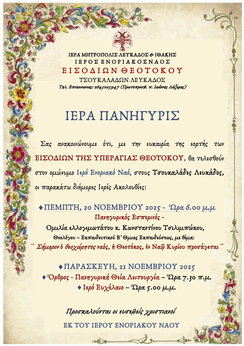 Πρόγραμμα Ιεράς Πανηγύρεως εορτής Εισοδίων Θεοτόκου στον ομώνυμο Ιερό Ενοριακό Ναό στους Τσουκαλάδες Λευκάδος.