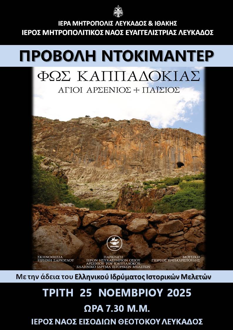 «ΦΩΣ ΚΑΠΠΑΔΟΚΙΑΣ: ΑΓΙΟΙ ΑΡΣΕΝΙΟΣ + ΠΑΪΣΙΟΣ» Προβολή ντοκιμαντέρ στον Ιερό Ναό Εισοδίων Θεοτόκου Λευκάδος.