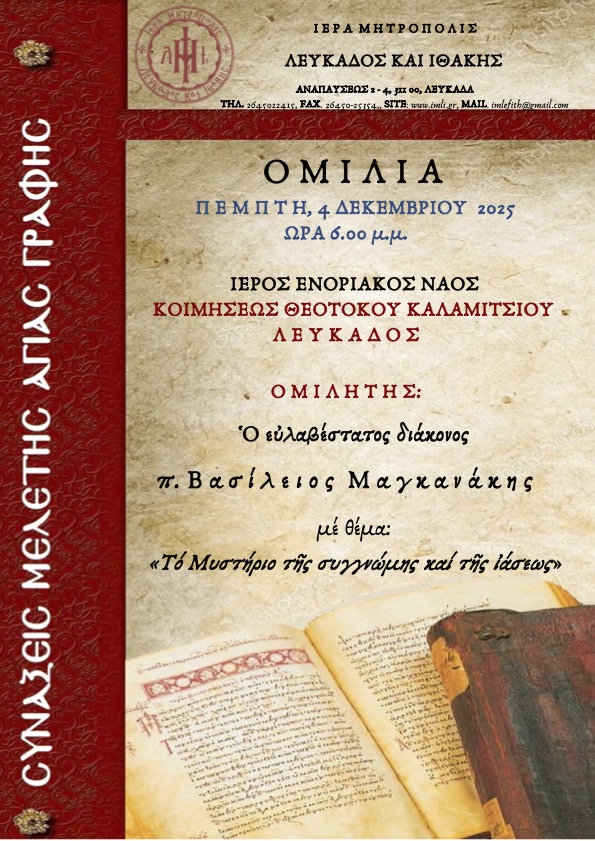 Το απόγευμα της Πέμπτης, 4 Δεκεμβρίου 2025 θα τελεσθεί στον Ιερό Ενοριακό Ναό Κοιμήσεως Θεοτόκου