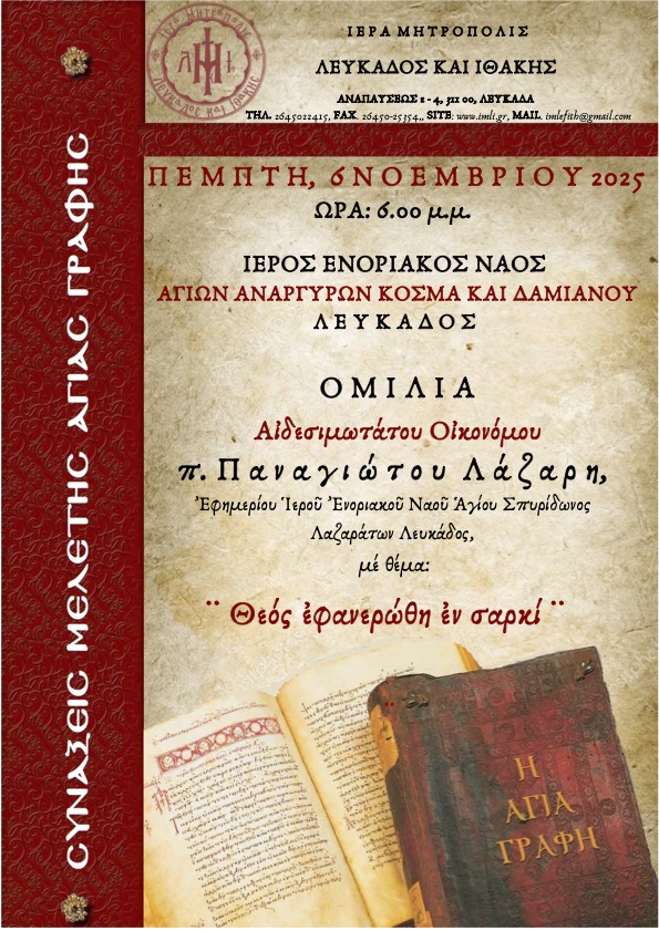 Ακολουθεί πρόγραμμα - πρόσκληση δεύτερης Σύναξης Μελέτης Αγίας Γραφής στην πόλη της Λευκάδος με ομιλητή