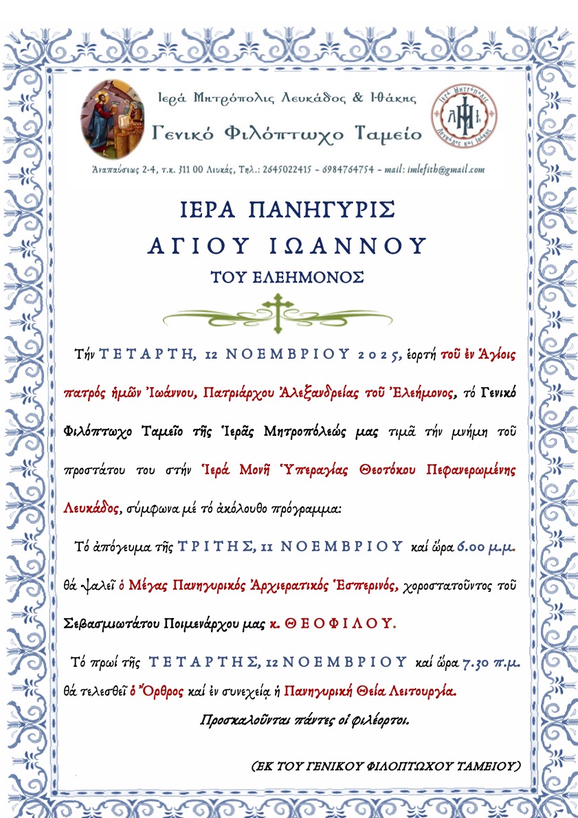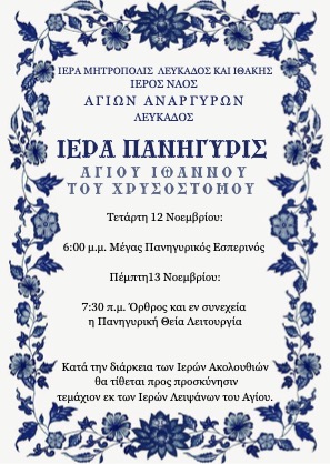 Πρόγραμμα Ιεράς Πανηγύρεως μνήμης Αγίου Ιωάννου Χρυσοστόμου στον Ιερό Ενοριακό Ναό Αγίων Αναργύρων Λευκάδος.