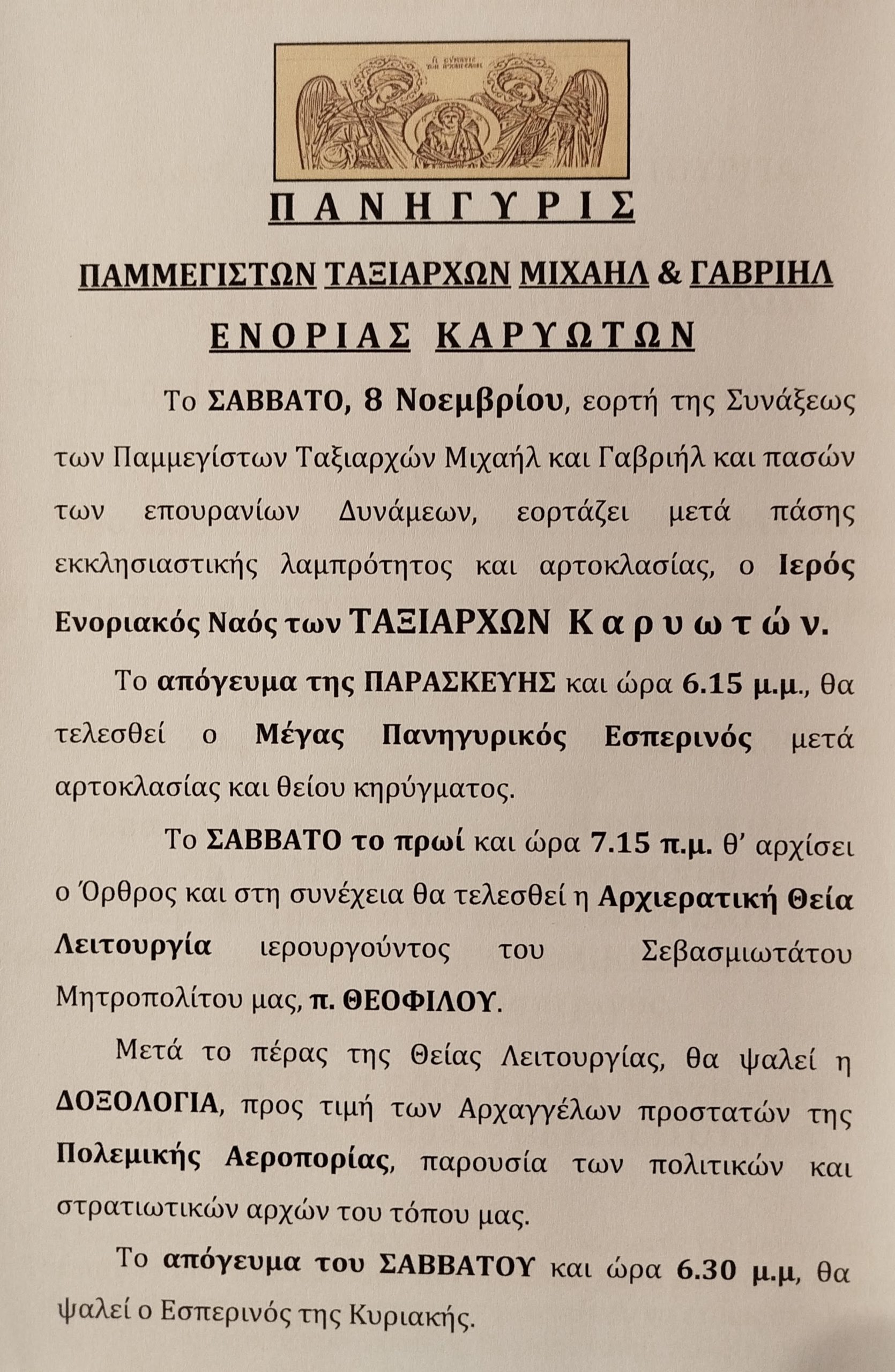 Πρόγραμμα εορτασμού Συνάξεως Παμμεγίστων Ταξιαρχών στον ομώνυμο Ιερό Ενοριακό Ναό στους Καρυώτες Λευκάδος.
