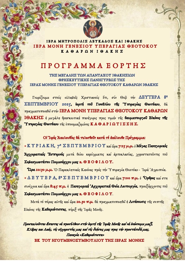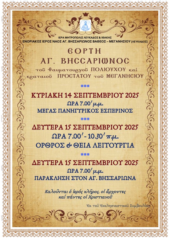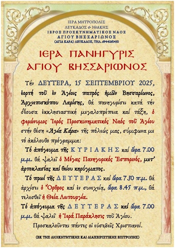 Ακολουθεί πρόγραμμα Ιεράς Πανηγύρεως Ιερού Ενοριακού Ναού Αγίου Βησσαρίωνος Μεγανησίου Λευκάδος.