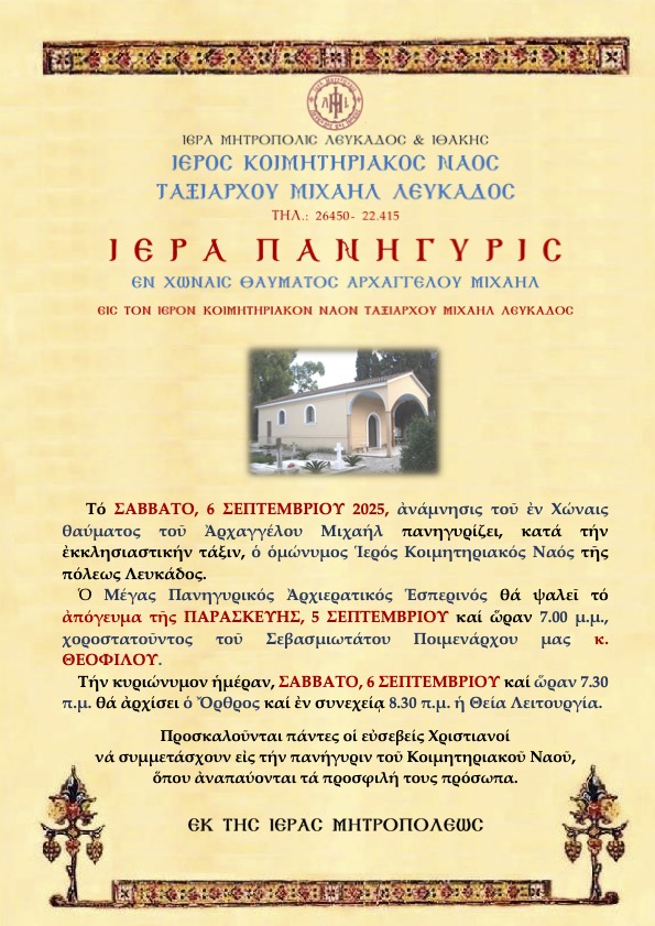 Τό ΣΑΒΒΑΤΟ, 6 ΣΕΠΤΕΜΒΡΙΟΥ 2025, ἀνάμνησις τοῦ ἐν Χώναις θαύματος τοῦ Ἀρχαγγέλου Μιχαήλ πανηγυρίζει, κατά