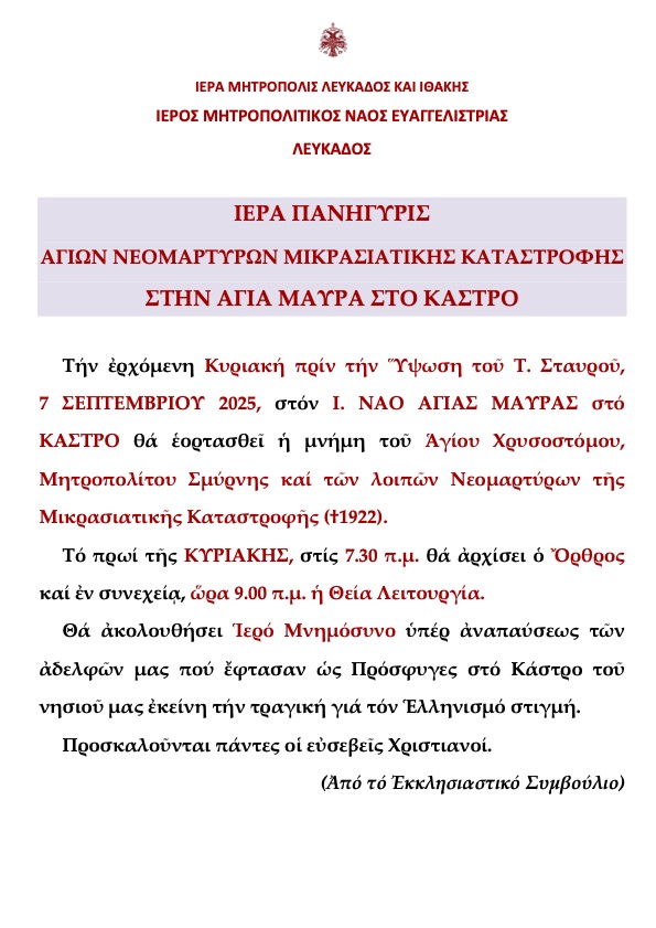 Τήν ἐρχόμενη Κυριακή πρίν τήν Ὕψωση τοῦ Τ. Σταυροῦ, 7 ΣΕΠΤΕΜΒΡΙΟΥ 2025, στόν Ι. ΝΑΟ