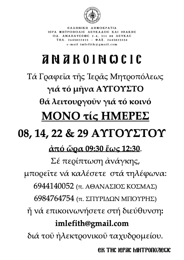 Τά Γραφεῖα τῆς Ἱερᾶς Μητροπόλεως Λευκάδος καί Ἰθάκης λειτουργοῦν διά τό κοινόν ΚΑ Θ Η