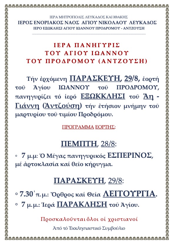 Τήν ἐρχόμενη ΠΑΡΑΣΚΕΥΗ, 29/8, ἑορτή τοῦ Ἁγίου ΙΩΑΝΝΟΥ τοῦ ΠΡΟΔΡΟΜΟΥ,πανηγυρίζει τό ἱερό ΕΞΩΚΚΛΗΣΙ τοῦ Ἅη