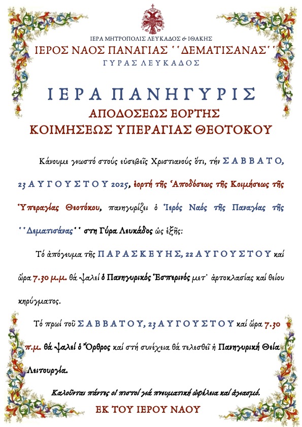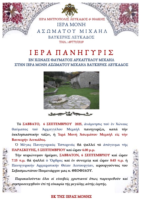 Πρόγραμμα Ιεράς Πανηγύρεως Ιεράς Μονής Ασωμάτου Μιχαήλ Βαυκερής Λευκάδος.