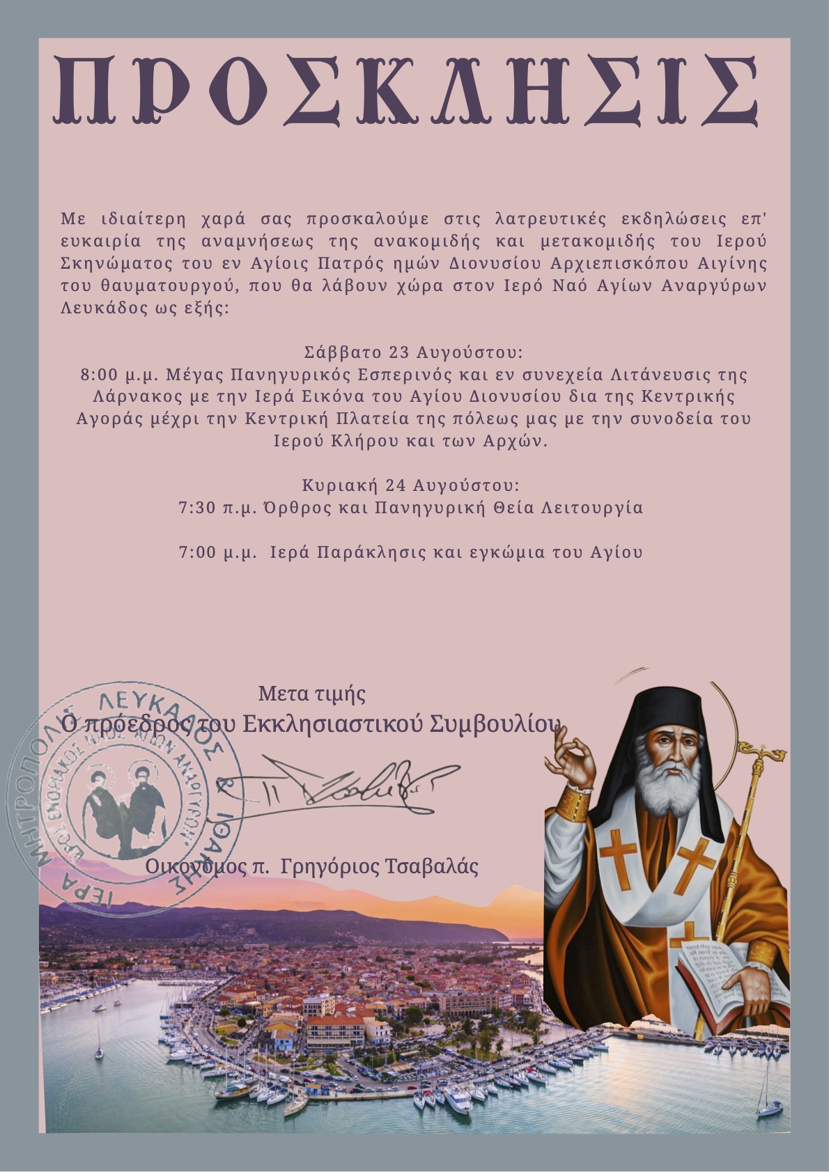 Ακολουθεί πρόγραμμα Ιεράς Πανηγύρεως μεταθέσεως Ιερού Σκηνώματος Αγίου Διονυσίου στον Ιερό Ενοριακό Ναό Αγίων Αναργύρων