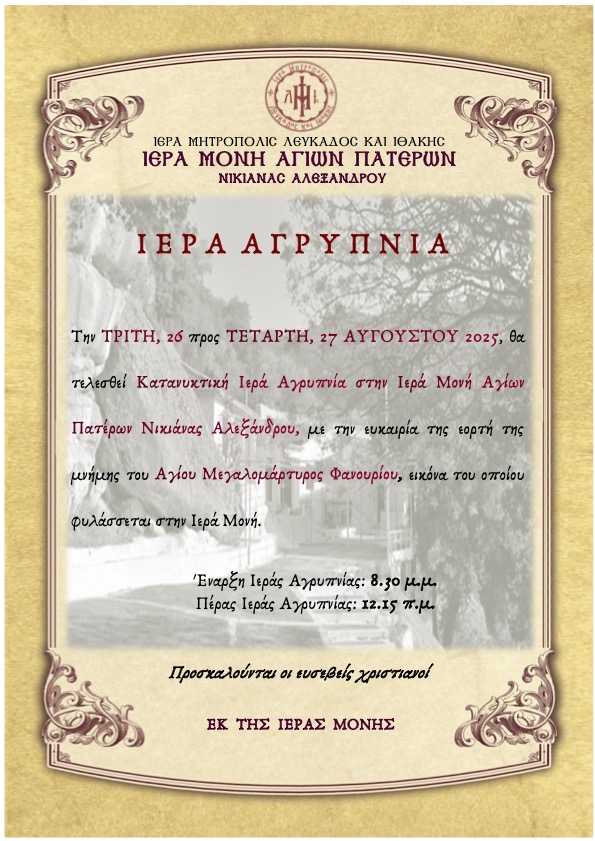 Την ΤΡΙΤΗ, 26 προς ΤΕΤΑΡΤΗ, 27 ΑΥΓΟΥΣΤΟΥ 2025, θα τελεσθεί Κατανυκτική Ιερά Αγρυπνία στην Ιερά