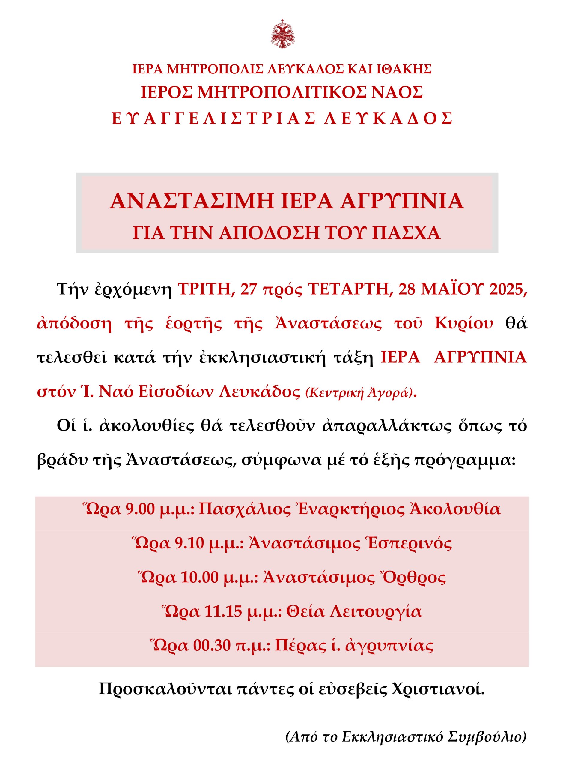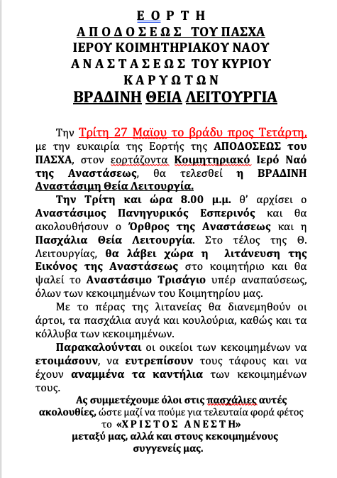 Τήν ἐρχόμενη ΤΡΙΤΗ, 27 πρός ΤΕΤΑΡΤΗ, 28 ΜΑΪΟΥ 2025, ἀπόδοση τῆς ἑορτῆς τῆς Ἀναστάσεως τοῦ