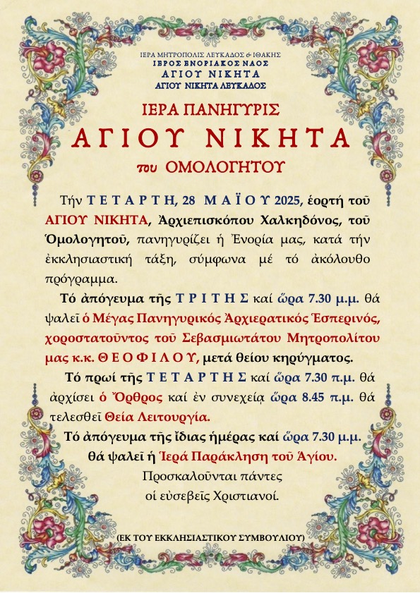 Ακολουθεί πρόγραμμα Ιεράς Πανηγύρεως Ιερού Ενοριακού Ναού Αγίου Νικήτα Λευκάδος.