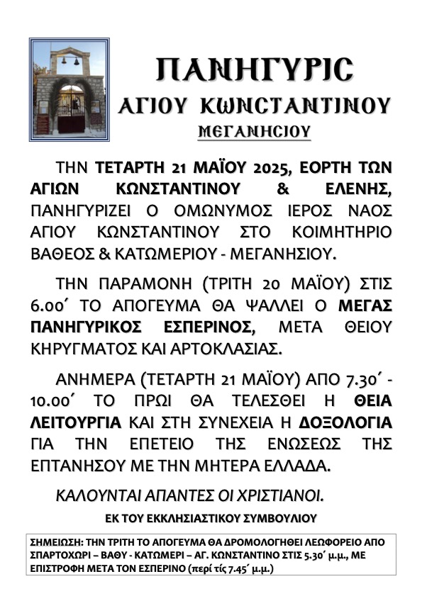 Ακολουθεί πρόγραμμα Ιεράς Πανηγύρεως Ιερού Κοιμητηριακού Ναού Αγίων Κωνσταντίνου και Ελένης Βαθέος και Κατωμερίου Μεγανησίου.