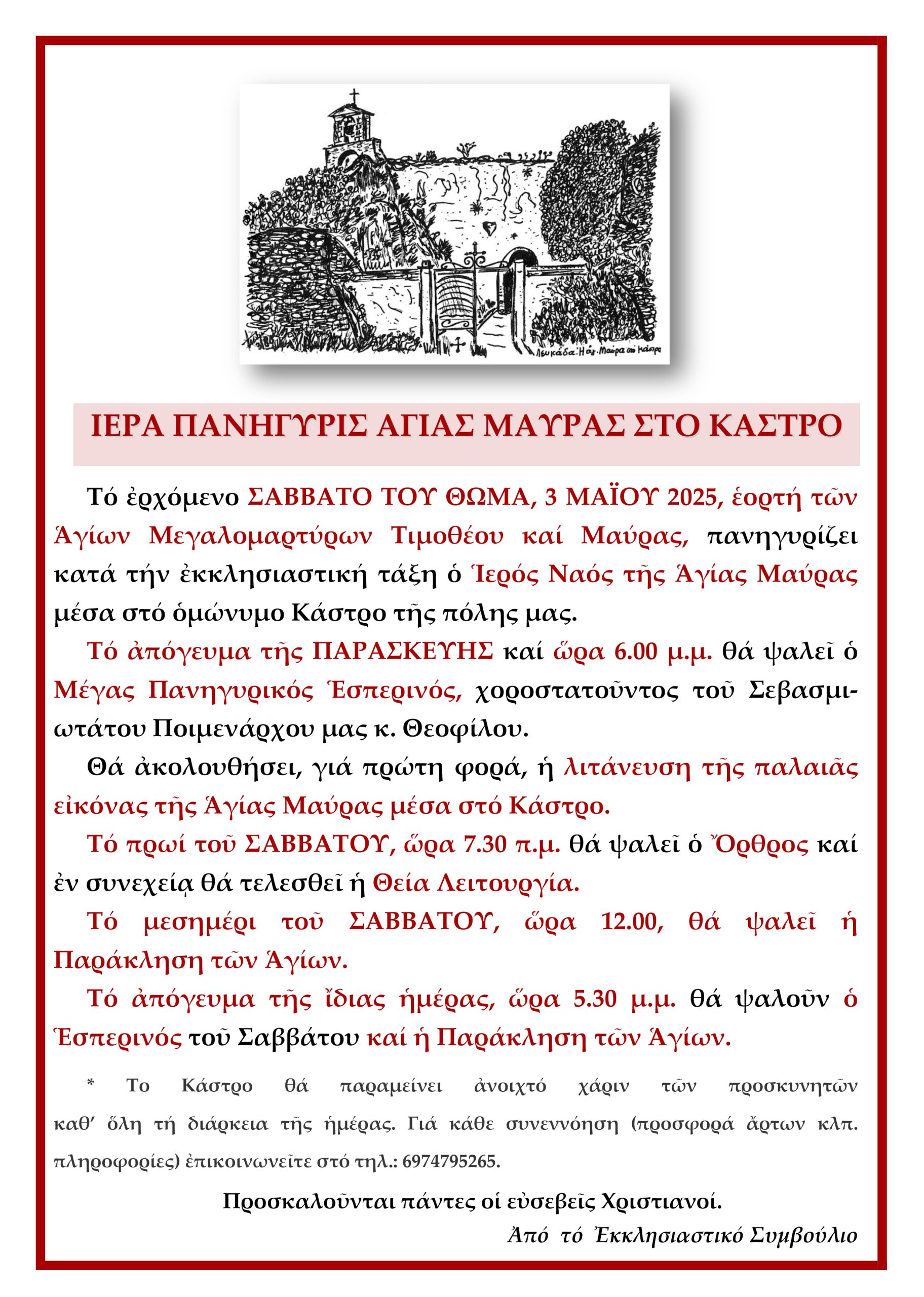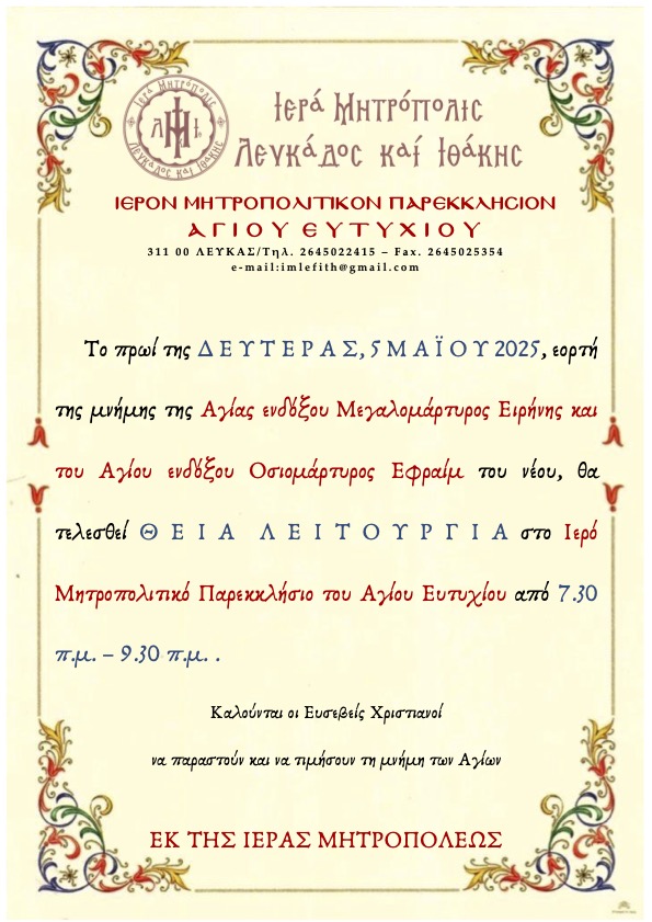 Θεία Λειτουργία στη μνήμη της Αγίας Μεγαλομάρτυρος Ειρήνης και του Αγίου Οσιομάρτυρος Εφραίμ στο Ιερό Μητροπολιτικό Παρεκκλήσιο Αγίου Ευτυχίου Λευκάδος.