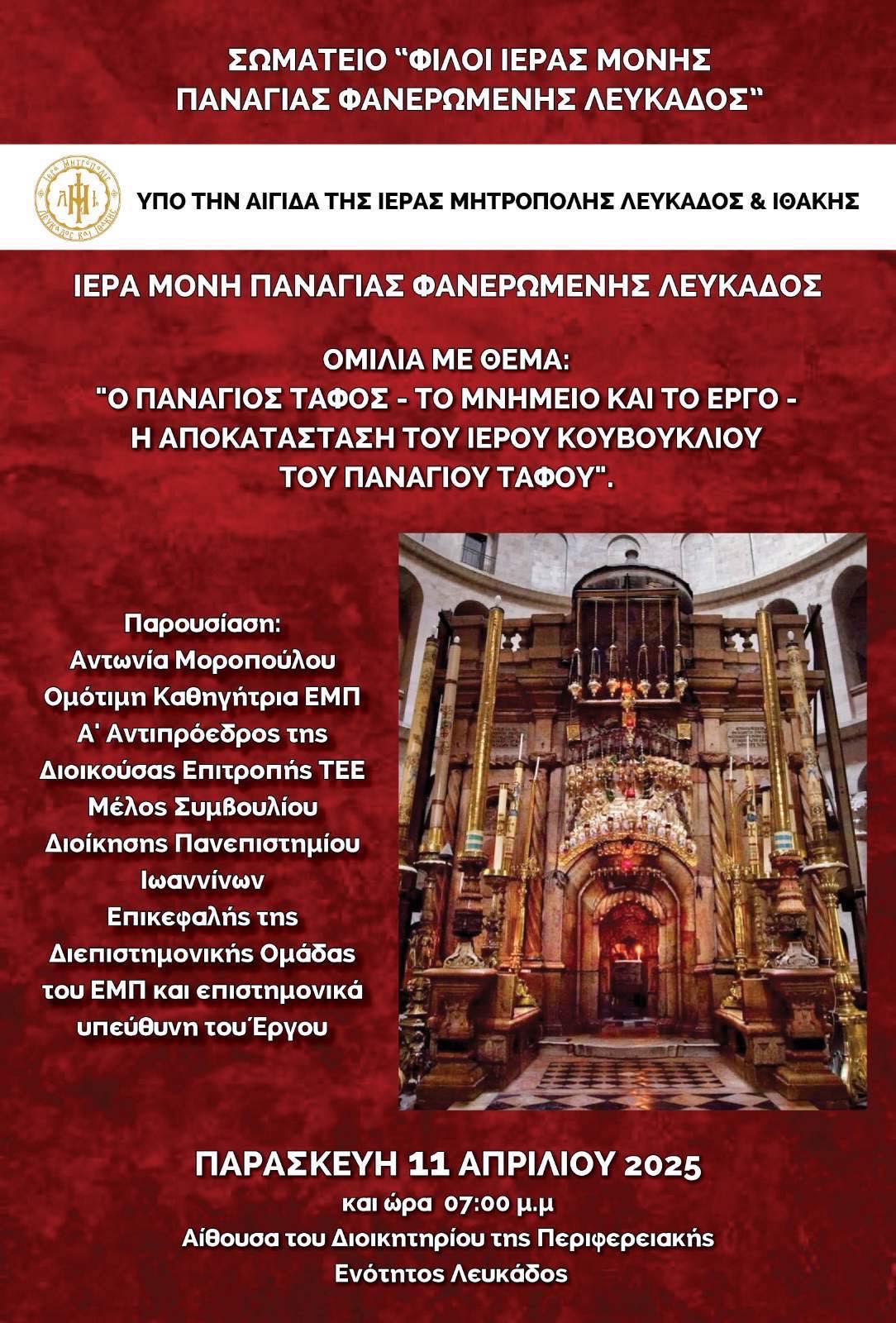 Το Σωματείο «Φίλοι Ιεράς Μονής Παναγίας Φανερωμένης Λευκάδος» σας προσκαλεί στην εκδήλωση η οποία πραγματοποιείται