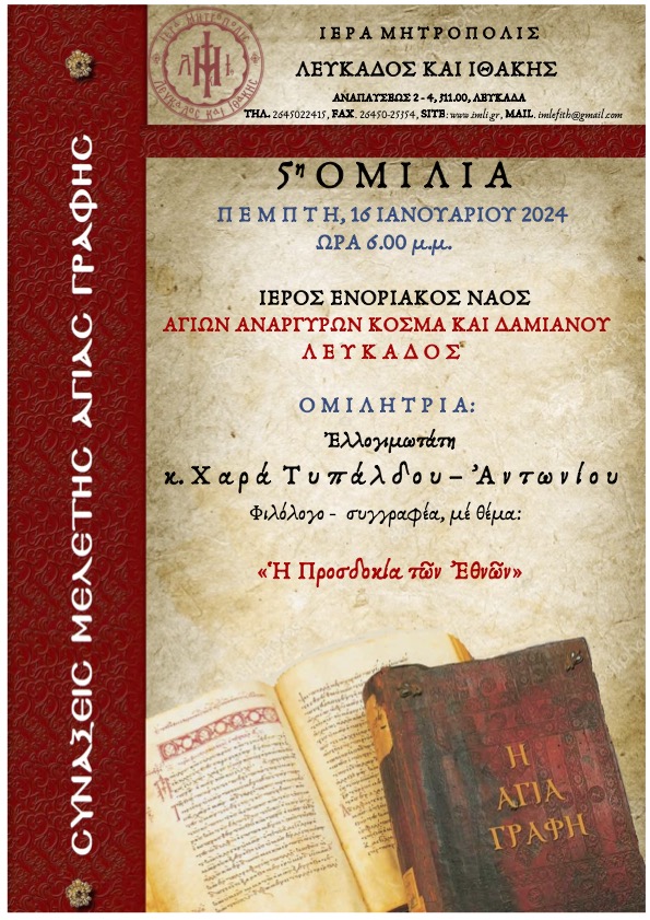 Πραγματοποιήθηκε η 5η Σύναξη Μελέτης Αγίας Γραφής με ομιλήτρια την ελλογιμώτατη κ. Χαρά Τυπάλδου – Αντωνίου.