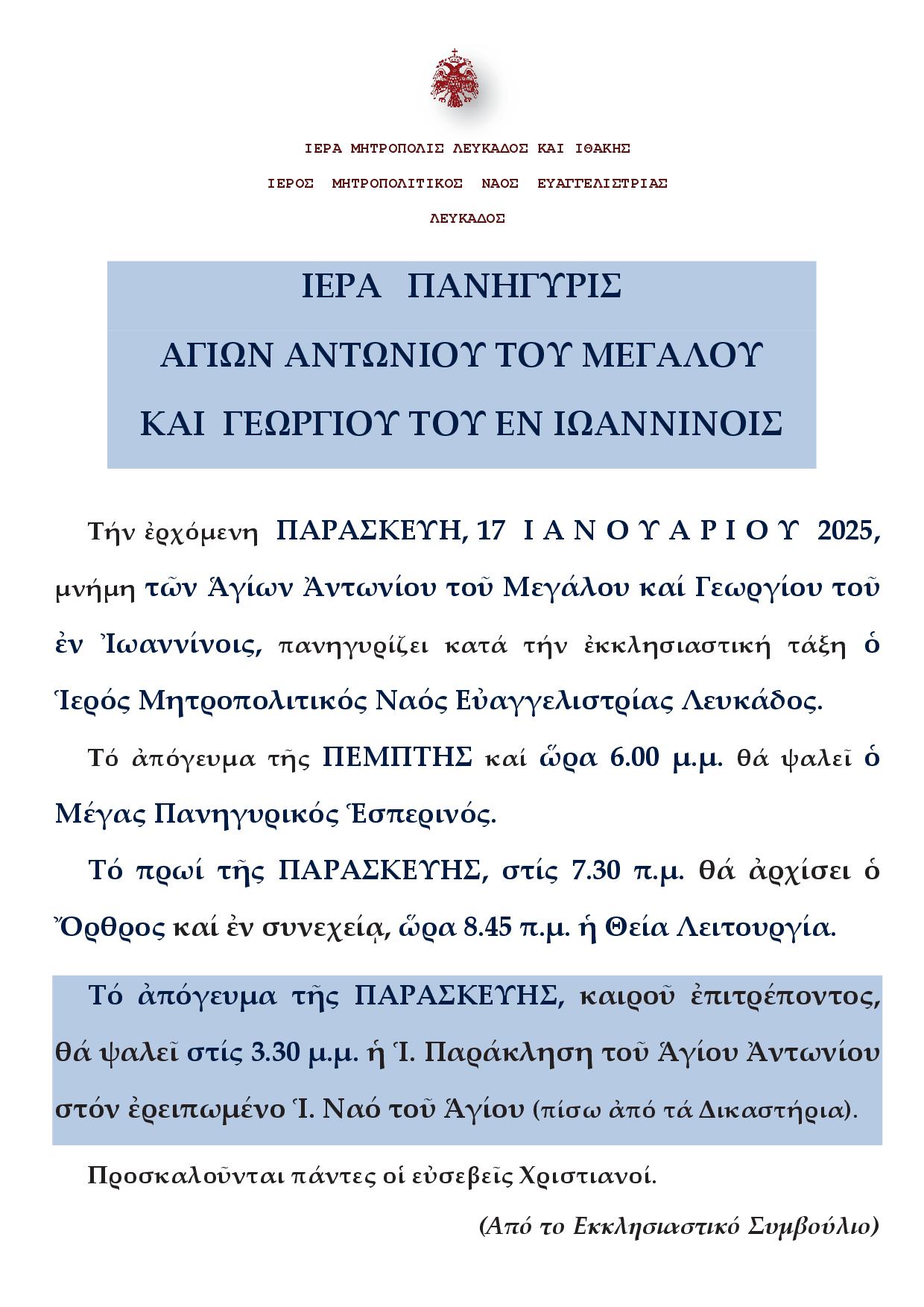 Τήν ἐρχόμενη ΠΑΡΑΣΚΕΥΗ, 17 Ι Α Ν Ο Υ Α Ρ Ι Ο Υ 2025,