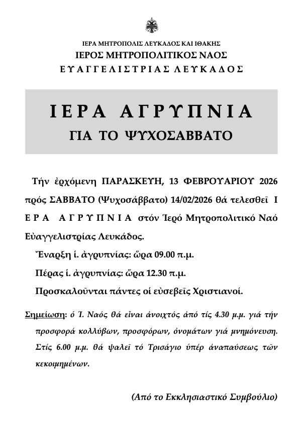 Τήν ἐρχόμενη ΠΑΡΑΣΚΕΥΗ, 13 ΦΕΒΡΟΥΑΡΙΟΥ 2026 πρός ΣΑΒΒΑΤΟ (Ψυχοσάββατο) 14/02/2026 θά τελεσθεῖ Ι Ε Ρ