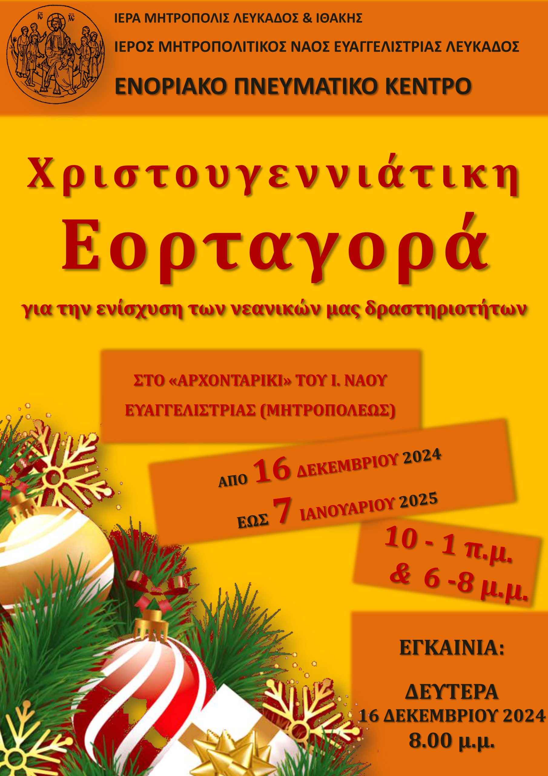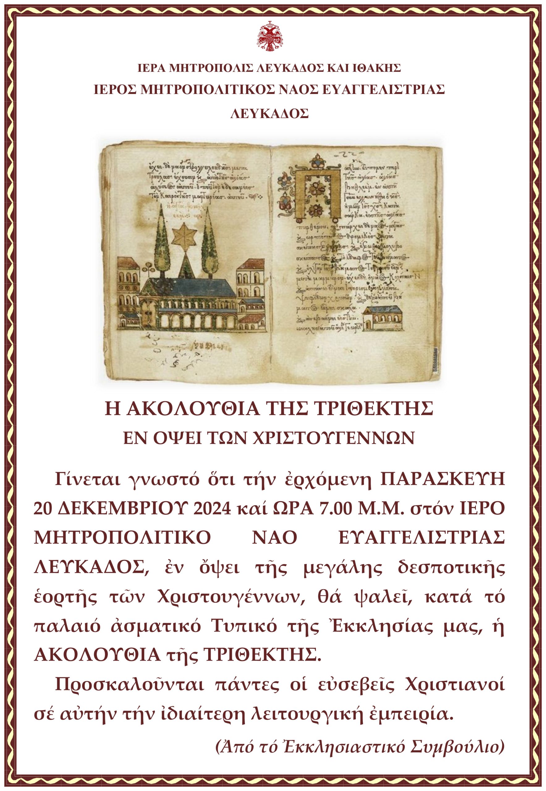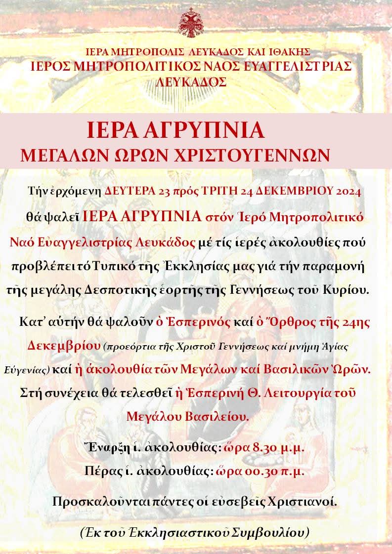 Ακολουθεί πρόγραμμα Ιεράς Αγρυπνίας Μεγάλων Ωρών Χριστουγέννων στον Ιερό Μητροπολιτικό Ναό Ευαγγελιστρίας Λευκάδος.