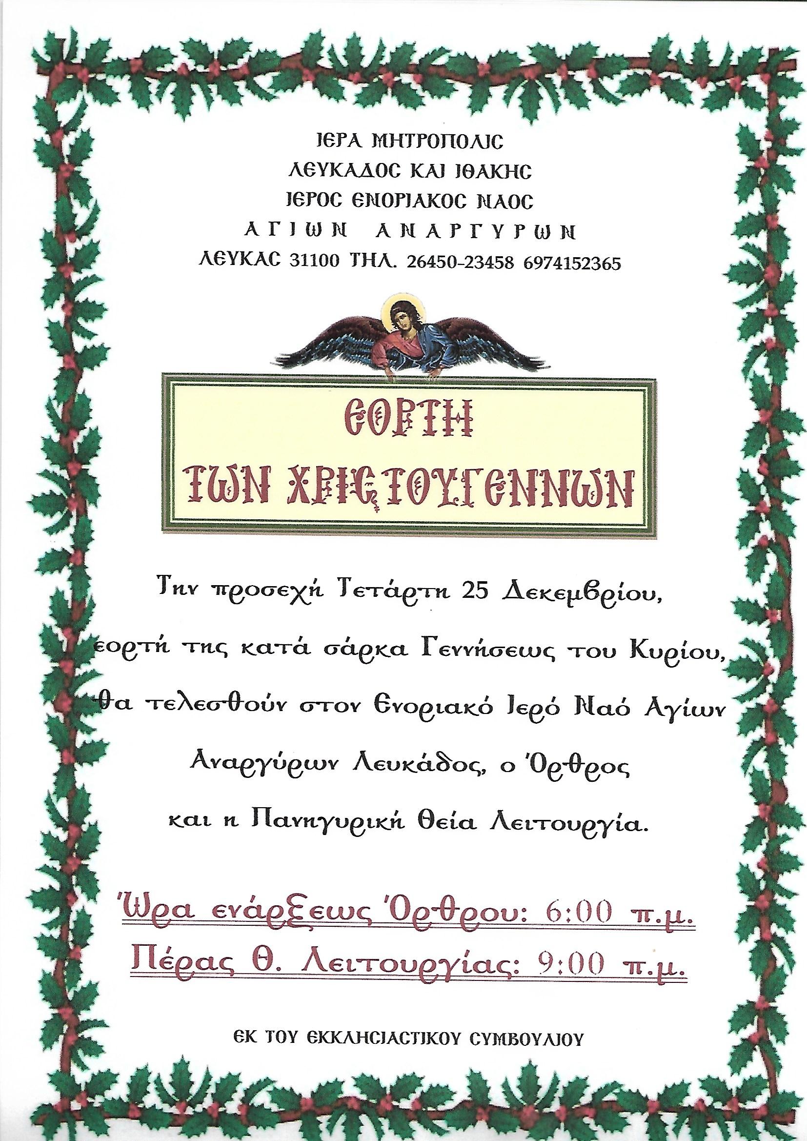 Ακολουθεί πρόγραμμα εορτασμού Χριστουγέννων στον Ιερό Ενοριακό Ναό Αγίων Αναργύρων Κοσμά και Δαμιανού Λευκάδος.