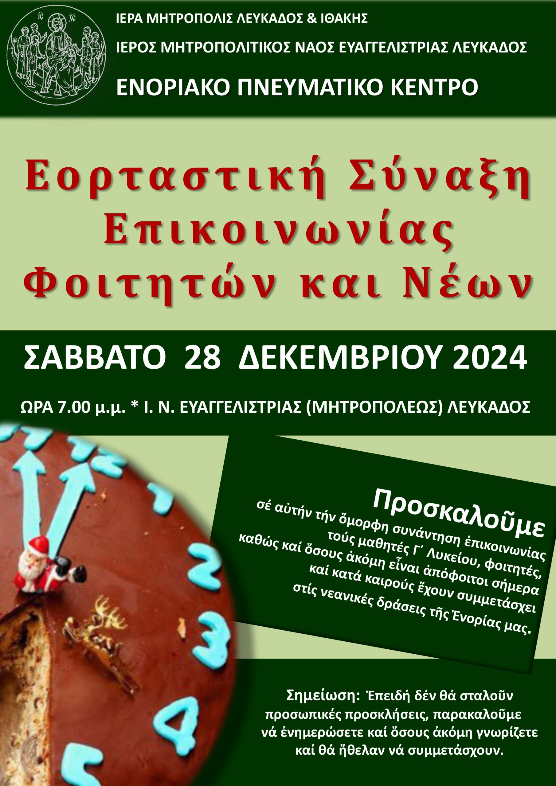 Εορταστική Σύναξη Επικοινωνίας Φοιτητών και Νέων – Αποφοίτων Νεανικών Συντροφιών Ι. Ν. Ευαγγελιστρίας (Μητροπόλεως) Λευκάδος.