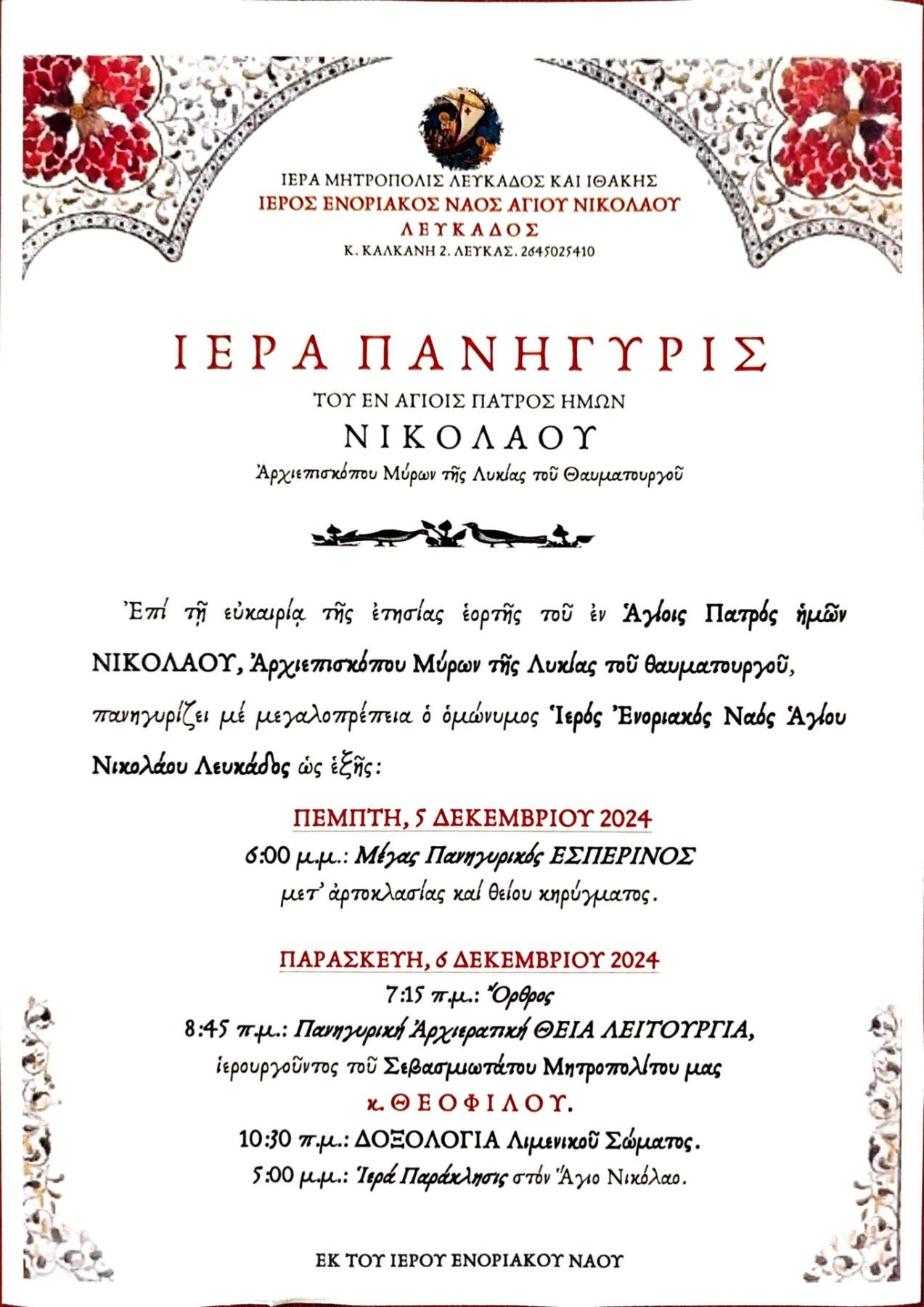 Ακολουθεί πρόγραμμα Ιεράς Πανηγύρεως Ιερού Ενοριακού Ναού Αγίου Νικολάου Λευκάδος.