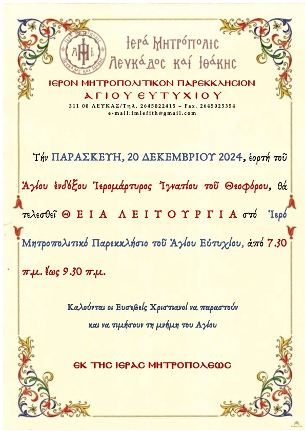 Θείες Λειτουργίες μηνός Δεκεμβρίου 2024 στο Ιερό Μητροπολιτικό Παρεκκλήσιο Αγίου Ευτυχίου.