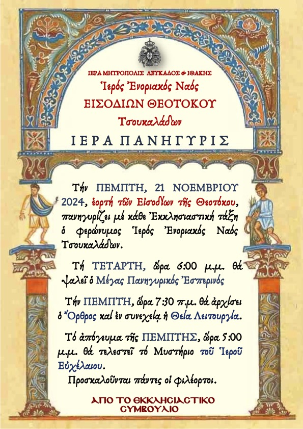 ΙΕΡΑ ΠΑΝΗΓΥΡΙΣ ΕΙΣΟΔΙΩΝ ΤΗΣ ΘΕΟΤΟΚΟΥ Τήν ἐρχόμενη ΠΕΜΠΤΗ, 21 ΝΟΕΜΒΡΙΟΥ 2024, ἑορτή τῶν Εἰσοδίων τῆς