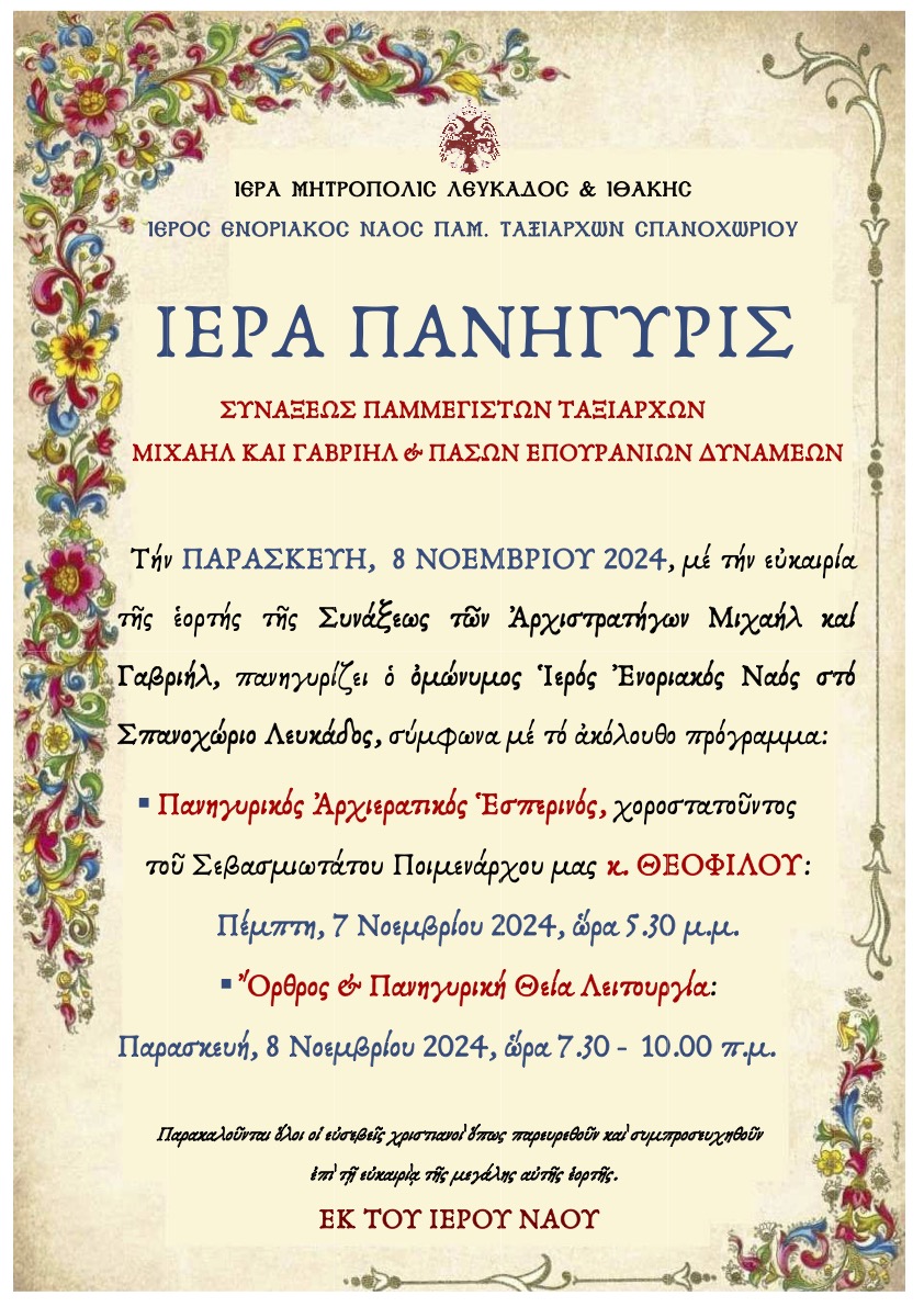 Τήν ΠΑΡΑΣΚΕΥΗ, 8 ΝΟΕΜΒΡΙΟΥ 2024, μέ τήν εὐκαιρία τῆς ἑορτής τῆς Συνάξεως τῶν Ἀρχιστρατήγων Μιχαήλ