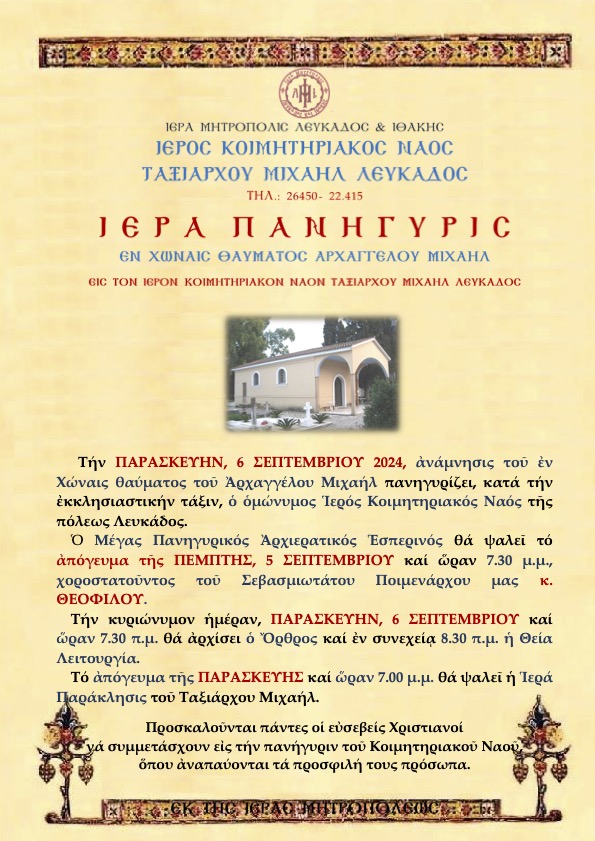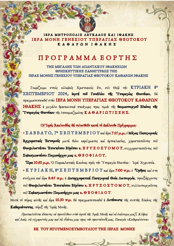 Πρόγραμμα Ιεράς Πανηγύρεως Ιεράς Μονής Γενεσίου Υπεραγίας Θεοτόκου Καθαρών Ιθάκης.