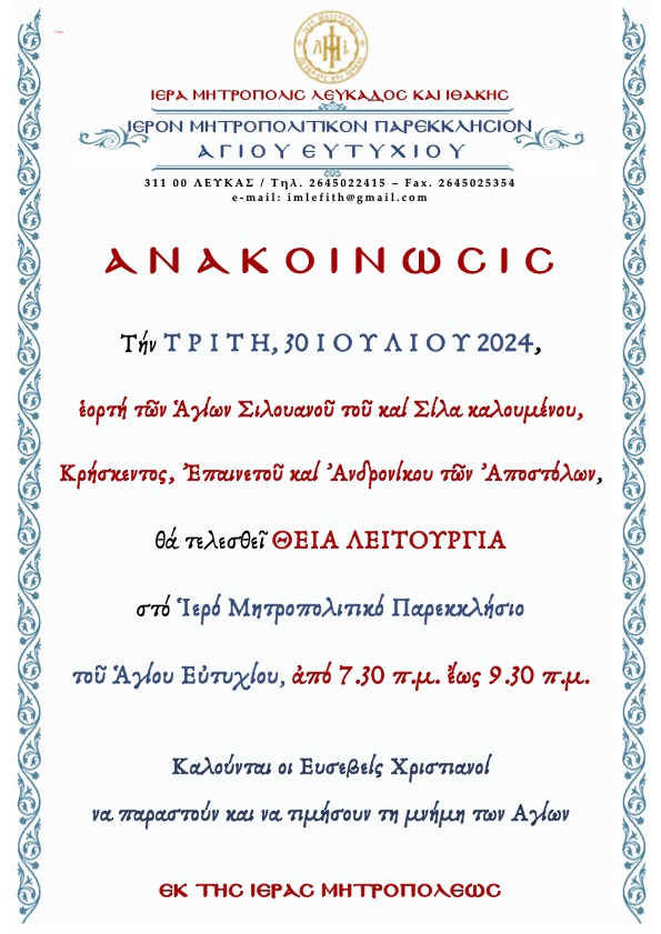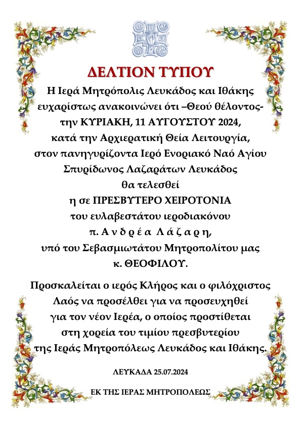 ΔΕΛΤΙΟΝ ΤΥΠΟΥ Η Ιερά Μητρόπολις Λευκάδος και Ιθάκης ευχαρίστως ανακοινώνει ότι –Θεού θέλοντος- την ΚΥΡΙΑΚΗ,