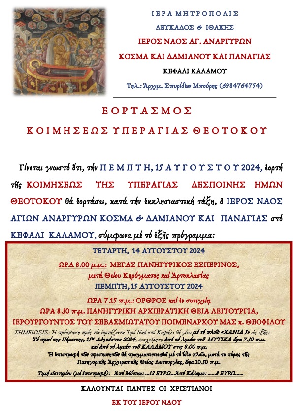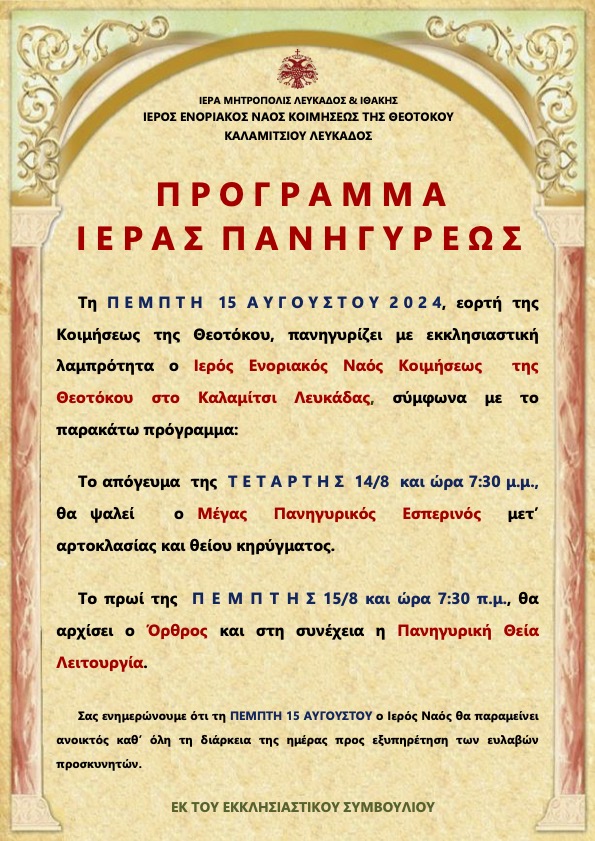 Ακολουθεί πρόγραμμα Ιεράς Πανηγύρεως Ιερού Ενοριακού Ναού Κοιμήσεως Θεοτόκου Καλαμιτσίου Λευκάδος.