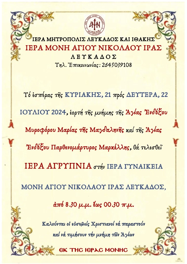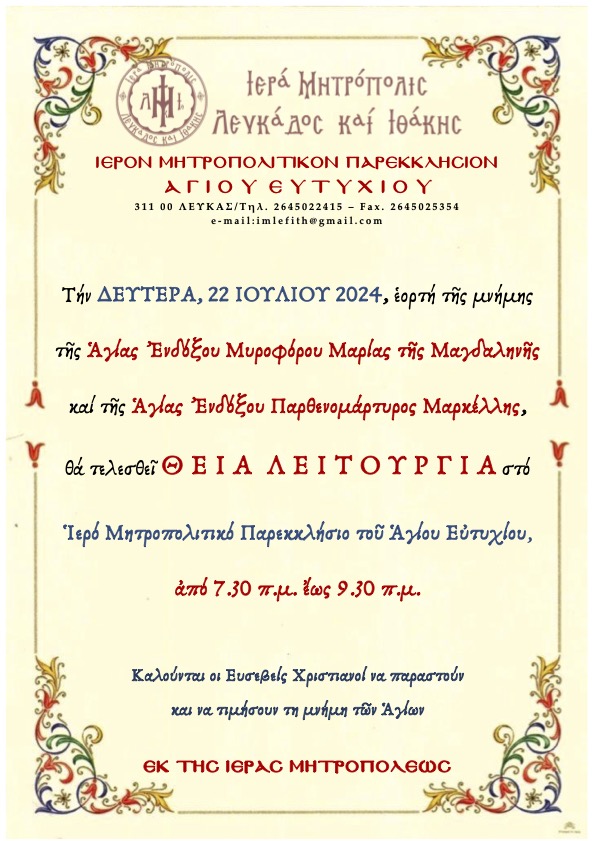 Τήν ΔΕΥΤΕΡΑ, 22 ΙΟΥΛΙΟΥ 2024, ἑορτή τῆς μνήμης τῆς Ἁγίας ’Ενδόξου Μυροφόρου Μαρίας τῆς Μαγδαληνῆς