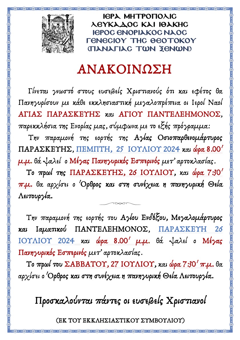 Γίνεται γνωστό στους ευσεβείς Χριστιανούς ότι και εφέτος θα Πανηγυρίσουν με κάθε εκκλησιαστική μεγαλοπρέπεια οι