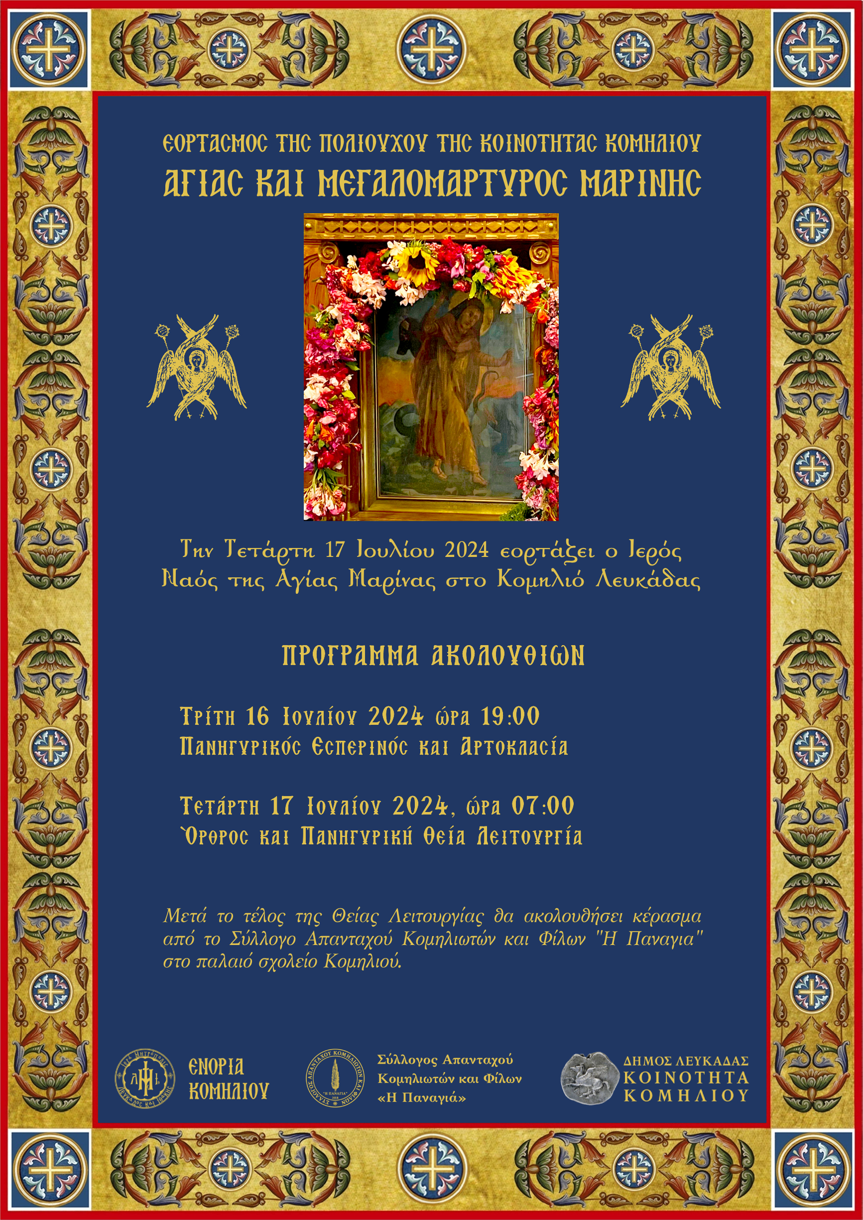 Ακολουθεί πρόγραμμα Ιεράς Πανηγύρεως Ιερού Ναού Αγίας Μαρίνης Κομηλιού Λευκάδος.