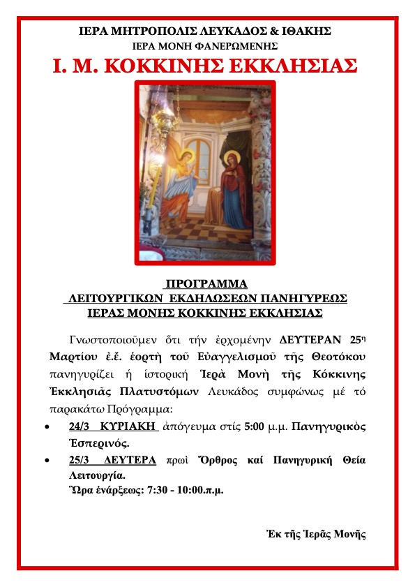 Ακολουθεί πρόγραμμα λειτουργικών εκδηλώσεων Ιεράς Πανηγύρεως Ιεράς Μονής Κόκκινης Εκκλησιάς Πλατυστόμων, Μετοχίου Ιεράς Μονής Υπεραγίας