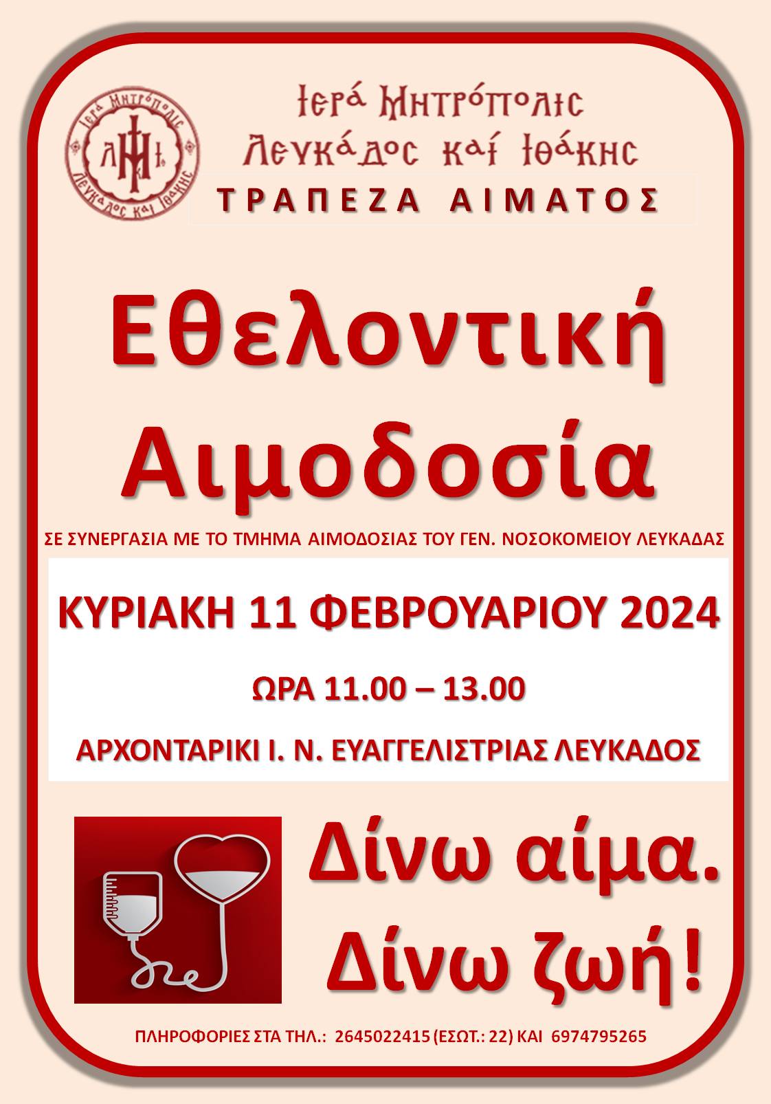 ΔΕΛΤΙΟ ΤΥΠΟΥ Κυριακή 11 Φεβρουαρίου 2024: «Εθελοντική Αιμοδοσία» για την Τράπεζα Αίματος της Ι. Μητροπόλεως