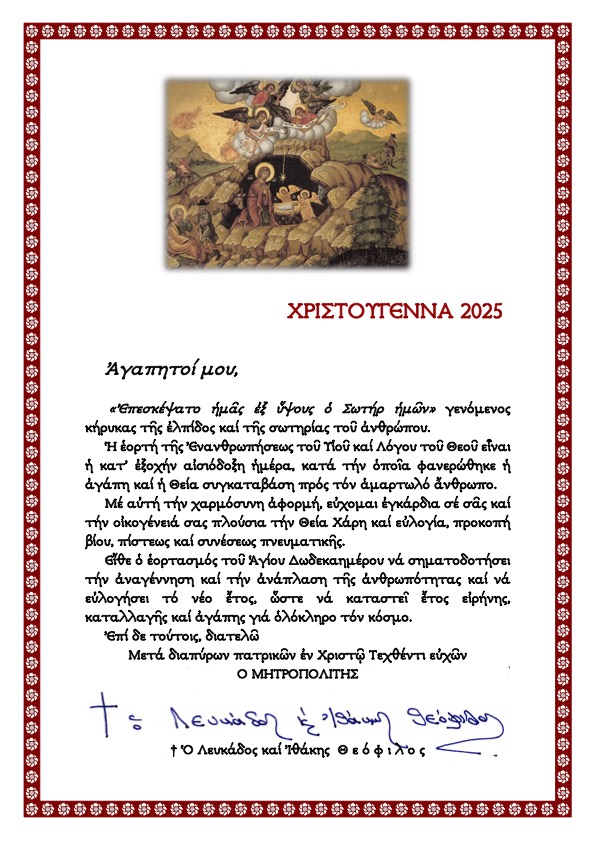 Ακολουθούν ευχές Αγίου Δωδεκαημέρου Χριστουγέννων 2025 Σεβασμιωτάτου Μητροπολίτου Λευκάδος και Ιθάκης κ. Θεοφίλου.