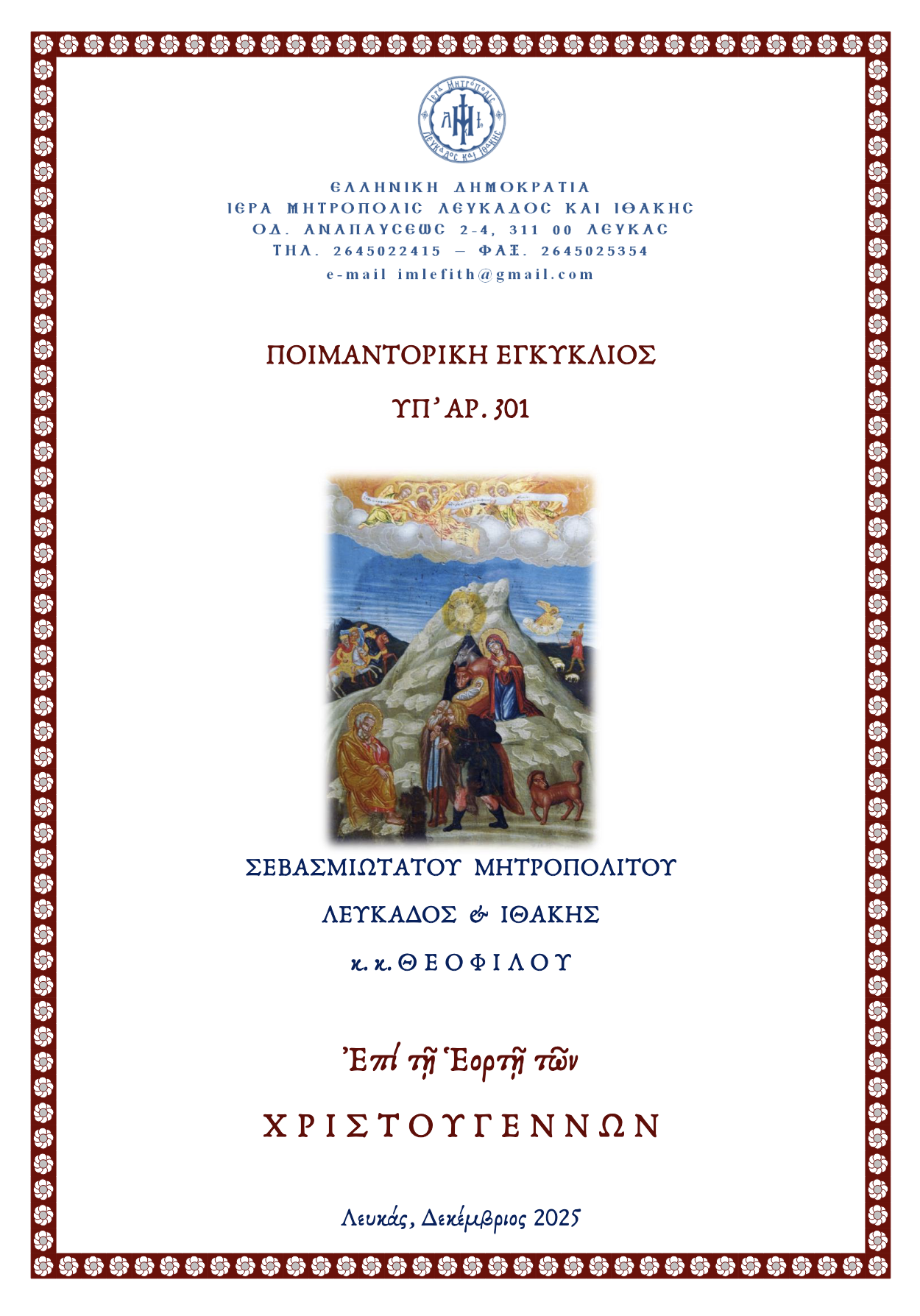 ΠΟΙΜΑΝΤΟΡΙΚΗ ΕΓΚΥΚΛΙΟΣ ΥΠ’ ΑΡ. 301 ΣΕΒΑΣΜΙΩΤΑΤΟΥ ΜΗΤΡΟΠΟΛΙΤΟΥ ΛΕΥΚΑΔΟΣ & ΙΘΑΚΗΣ κ. κ. Θ
