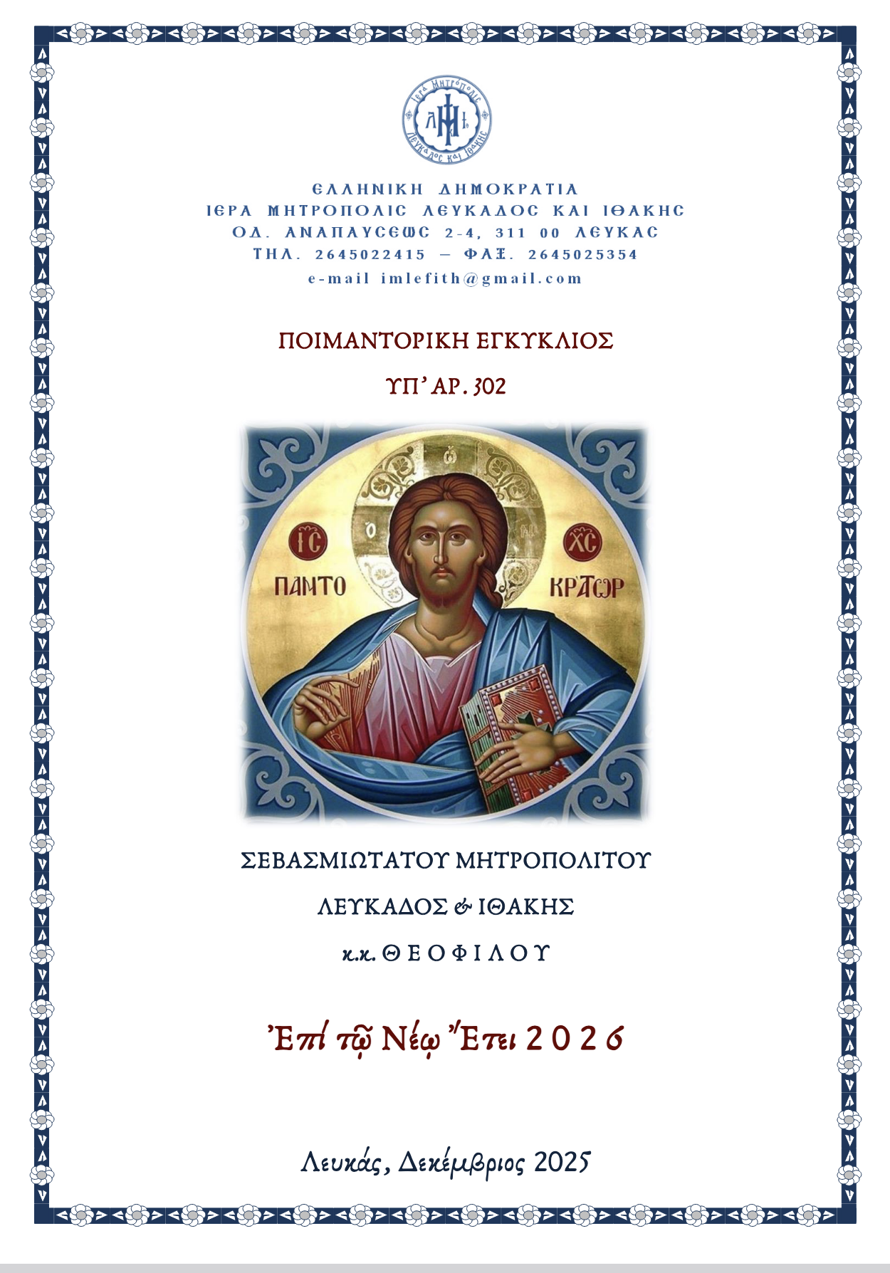 ΠΟΙΜΑΝΤΟΡΙΚΗ ΕΓΚΥΚΛΙΟΣ ΥΠ’ ΑΡ. 302 ΣΕΒΑΣΜΙΩΤΑΤΟΥ ΜΗΤΡΟΠΟΛΙΤΟΥ ΛΕΥΚΑΔΟΣ & ΙΘΑΚΗΣ κ.κ. Θ Ε Ο Φ
