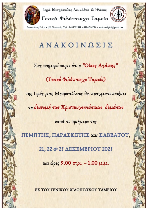 Σας ενημερώνουμε ότι ο “Οίκος Αγάπης” (Γενικό Φιλόπτωχο Ταμείο) της Ιεράς μας Μητροπόλεως θα πραγματοποιήσει