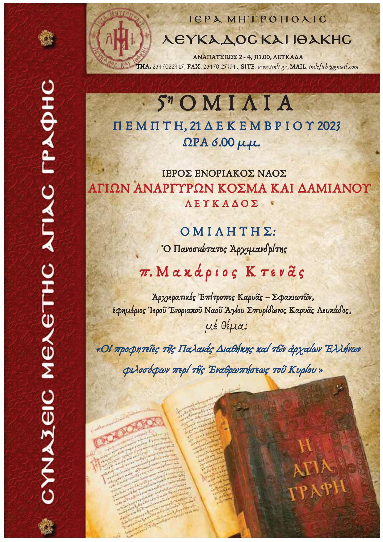 Πραγματοποιήθηκε στον Ιερό Ενοριακό Ναό Αγίων Αναργύρων Λευκάδος η πέμπτη Σύναξη Μελέτης Αγίας Γραφής της Ιεράς μας Μητροπόλεως.