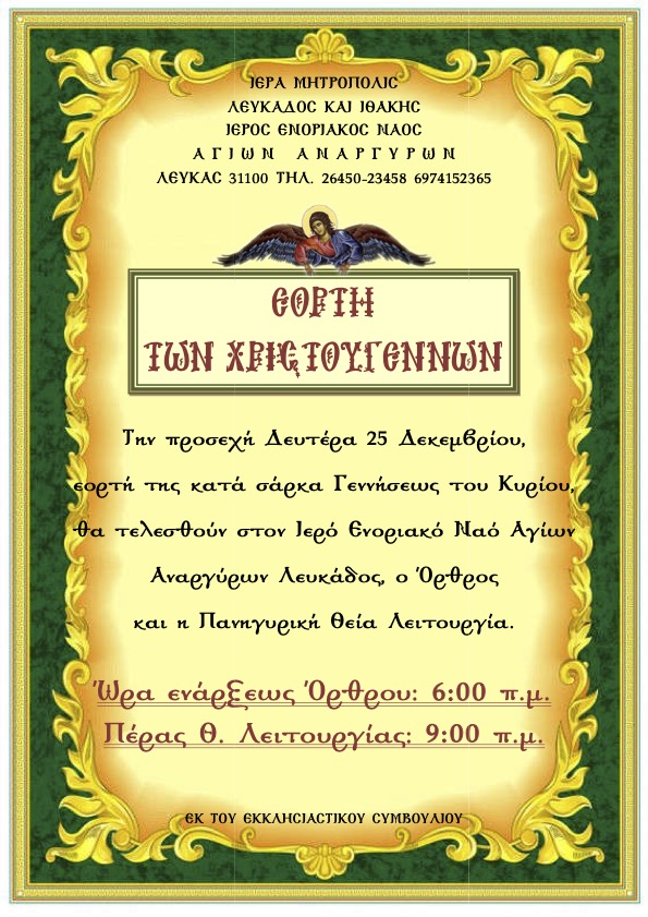 Πρόγραμμα εορτής Χριστουγέννων Ιερού Ενοριακού Ναού Αγίων Αναργύρων Λευκάδος.