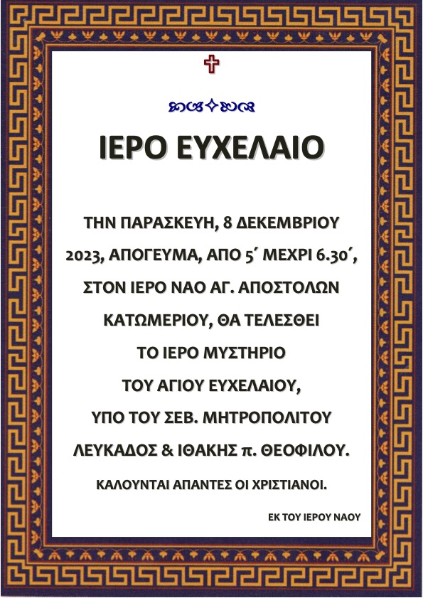 Σας ενημερώνουμε ότι την Κυριακή, 10 Δεκεμβρίου 2023 στην Ιερά Μονή Υπεραγίας Θεοτόκου Καθαρών Ιθάκης