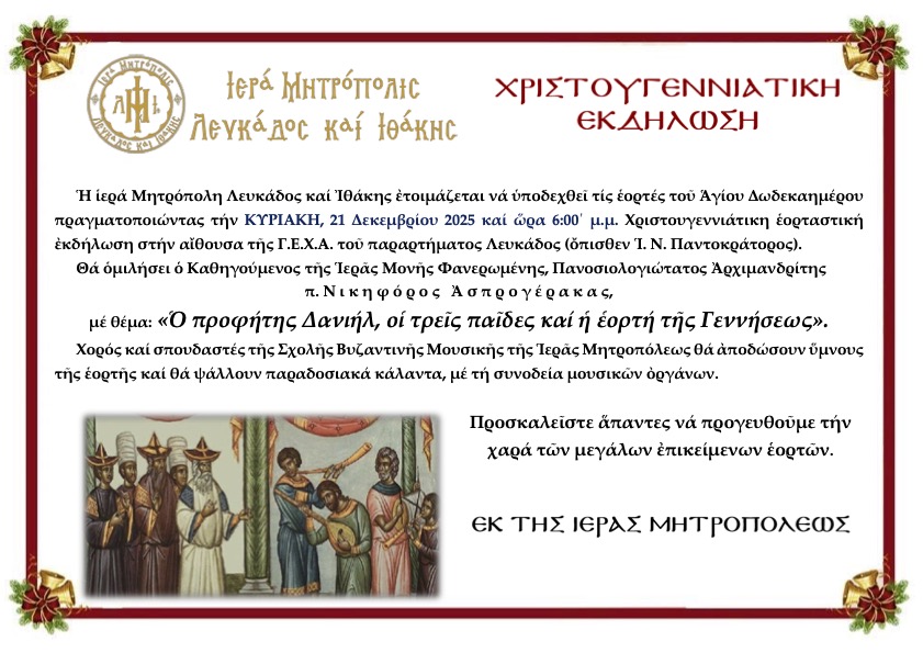 Η υπ᾽αριθμ. 301 Ποιμαντορική Εγκύκλιο του Σεβασμιωτάτου Μητροπολίτου Λευκάδος και Ιθάκης κ. Θεοφίλου επί τη Εορτή των Χριστουγέννων 2025.