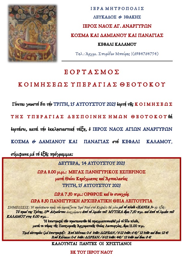 Πρόγραμμα Ιεράς Πανηγύρεως Ιερού Μετοχίου της Παναγίας των Κήπων Καλαμιτσίου Ιεράς Μονής Υπεραγίας Θεοτόκου Φανερωμένης Λευκάδος.